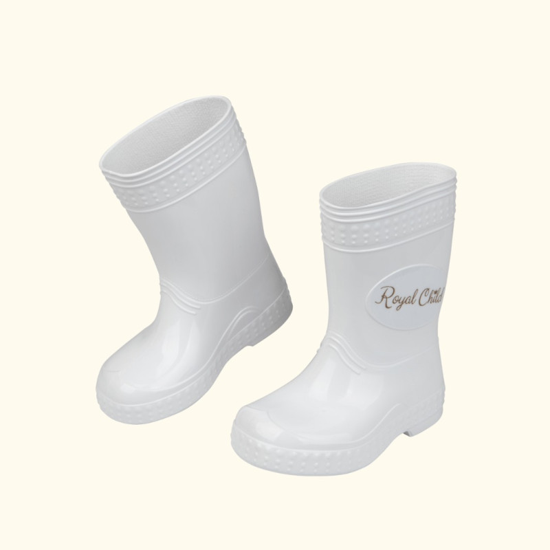 Wnętrze kaloszy jest wypełnione czerwoną skarpetką wewnętrzną, która jest zakładana już w procesie produkcyjnym. Składa się ona w 100% z bawełny. Na zewnątrz widzimy głęboki, czerwony kolor wraz ze stylowymi naklejkami – na jednym bucie z motywem złotej korony, a na drugim z napisem „Royal Child”. Naklejki te są dokładnie zgrzewane w procesie produkcyjnym, dzięki czemu cechują się one odpornością na zniszczenia.